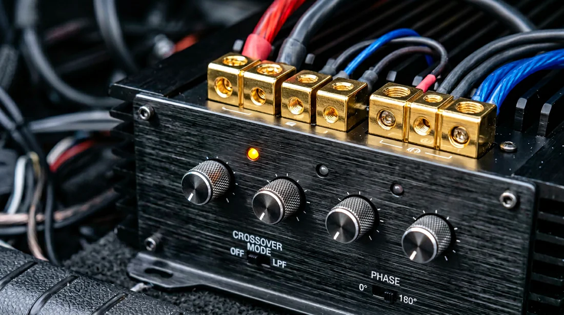 Le Gain (Level) n'est pas un bouton de volume. C'est un réglage pour adapter l'ampli au voltage de sortie de votre poste. Mettez le gain au minimum. Montez le volume de votre autoradio aux 3/4. Ensuite, montez doucement le gain de l'ampli jusqu'à entendre une distorsion (le son devient sale), puis redescendez tout juste un peu. Voilà votre réglage optimal.
