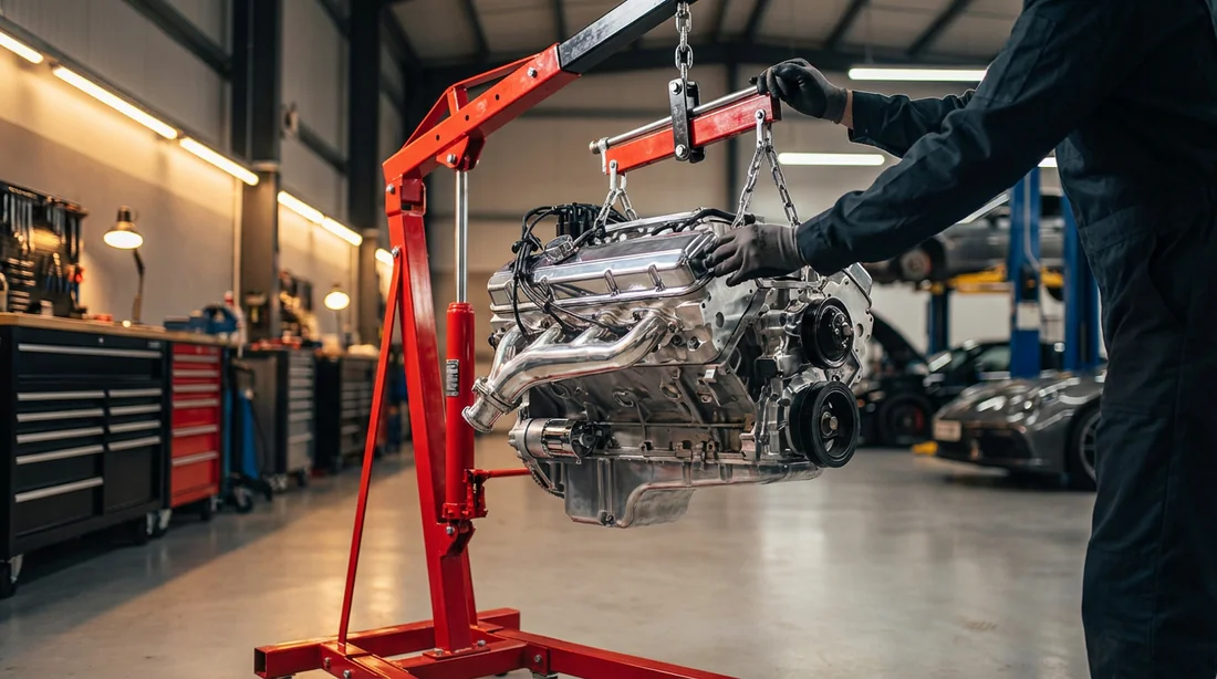 Si vous sortez un ensemble V6 + Boîte Auto (total > 350 kg) avec une chèvre d'entrée de gamme déployée à fond, vous flirtez avec le basculement ou la rupture hydraulique. Visez toujours une chèvre d'une capacité nominale d'au moins 1 tonne pour travailler sereinement.